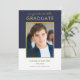 Feiern Sie den Absolventen mit dieser zeitgenössischen Stil Abschluss Ankündigung, die auch als Party Einladung dient. Auf der Vorderseite der Einladung befindet sich ein mariner und weißer Blockhintergrund mit einem dünnen goldenen Rahmen, der Ihr vertikales Portrait umgibt. Eine Textvorlage in knackiger moderner Schrift ist bereit, mit dem Namen, dem Unterrichtsjahr und der Schule des Absolventen zu personalisieren. Laden Sie das gewünschte Foto anstelle des Beispiels-Fotos, das auf dieser Karte angezeigt wird. Auf der Kartenrückseite befindet sich eine Textvorlage für die Party Einladung, die Sie mit Ihren Ereignisdetails personalisieren können. Dieses vielseitige, geschlechtsneutrale Design funktioniert gut für jeden Absolventen der Highschool, Uni oder Universität.