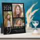 Elegantes Schwarz-Abschluss-Plakat mit einer 3-Foto-Collage und "Graduate" in einem stilvollen weißen Drehbuch. Fügen Sie den Namen, das Klassenjahr und die Schule oder Universität in der modernen weißen Typografie.