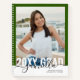 Individuell gedruckte Personalisiert Graduation Party oder Open House Gästebuch mit Modernem Skriptnamen und Jahrgangsklasse Überlaid auf einem Senior Foto auf der Frontabdeckung - in grün dargestellt, aber Sie können die Hintergrundfarbe ändern, um Ihren Schulfarben oder dem Party-Farbschema zu entsprechen.
