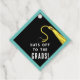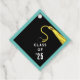 Creative Class of 2025 Graduierungsparty Gunst und Geschenketiketten mit schwarzen und goldenen Kappe und Glückwünschen auf aquamarinem blauen Hintergrund.