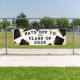 Abschluss-Gratulationen von Senior Class Party oder Zeremonie-Banner mit klassischen Schwarz-Gold-Graduiertenkappen. Bearbeiten Sie Text, um das Senior Class Year zu ändern.