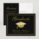Senden Sie Ihrer Familie und Freunden diese elegante Abschlussfeier Einladung Postcard. Dieses Design ist mit einer goldenen Graduationskappe versehen, die in einer modernen Imitat-Goldskripttypografie mit dem Aufdruck"Graduate" geschrieben ist. Oberhalb der Kappe sind Ihr Name, die Schule und die Jahresangaben unten auf schwarzem Hintergrund. Auf der Rückseite der Postkarte haben Sie Ihre Einladungsdetails in Imitat Gold auf Schwarz. Speziell für Sie konzipiert durch die Künstlerin ©Susan Coffey.