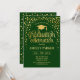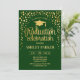 Einladung zur Graduiertenparty für Männer oder Frauen. Elegante Einladungskarte in Grün und Gold. Modernes, einfaches Design mit Imitate Glitzer Confetti, eine Kappe und Typografie Drehbuch Schriftart. Ideal für einen stilvollen Abschluss.