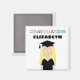 Illustration der Absolventin mit farbenfrohen Texten mit dem Text "Glückwunsch!"