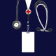 Medizinisches Design mit marineblau-blauen Krankenhauskeuchen, Stethoskop und Schweizerisches Armeemesser. Bearbeiten Sie den Text, um den Namen des Arztes hinzuzufügen.