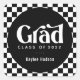 Grad. Retro Type Abschluss, Umschlag Aufkleber. Features, Retrotypografie in Weiß auf schwarzem Hintergrund und passende Schachbrett-Musterrahmen.