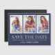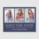 Moderner und trendiger 4-Foto-Abschluss Speichern Sie die Date-Magnetkarte für die Klasse 2022 oder ein Jahr. Auf der Vorderseite der Karte befinden sich 3 beliebte Fotos auf marineblau (einstellbare Farbe) Hintergrund, "Save the Date", Ihr Name, Schulname, Abschluss Jahr, Abschluss und Ort.