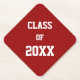 Set von 6 runden, absorbierenden, Pulp-Board Drink-Cochers für eine Graduierungsparty oder Klasse Wiedersehen, die Schulfarben Rot und Weiß sowie das Klassenjahr in fett, weiß gedruckt. Unterrichtsjahr nach Bedarf bearbeiten und ersetzen. Sie können auch einen anderen Untersetzer-Stil wählen.