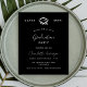 Eine moderne, elegante Abschlussfeier. Ein schwarzer Hintergrund, weißer Text. Personalisieren und fügen Sie einen Namen, ein Jahr und Details hinzu.