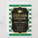 Einladung zur Graduiertenparty für Männer oder Frauen. Elegante Einladungskarte in Grün, Schwarz und Gold. Modernes, einfaches Design mit Streifen, einer Kappe, Imitaten Glitzer Gold und Typografie Drehbuch Schriftart. Ideal für einen stilvollen Abschluss.