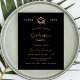 Eine moderne, elegante Abschlussfeier. Ein schwarzer Hintergrund mit einer goldenen Kappe. Personalisieren und fügen Sie einen Namen, ein Jahr und Details hinzu. Goldene Buchstaben.
