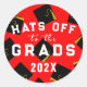 Kreative Abschluss-Umschlag Aufkleber, Gastgeschenk-Labels oder Gradschenkelaufkleber mit schwarzen und goldenen Graduierungskappen auf schulischem Rot-Hintergrund.