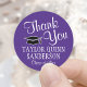 Fügen Sie eine elegante personalisierte Touch zu Uni oder High School Abschluss Dankeschön Karten und Gastgeschenke mit lila und weiß rund Aufkleber / Umschlag Aufkleber. Der gesamte Text ist einfach anzupassen. Das Design zeichnet sich durch einen lila Hintergrund, eine schwarze Mörtel-Kappe und eine moderne Schrift-Typografie im Kalligrafiestil aus. Herzlichen Glückwunsch an den Absolventen!