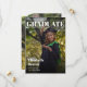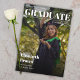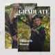 Eine moderne Abschlussanzeige, die wie ein Magazintitel aussieht. Darauf ist eine Absolventin zu sehen, die Konfetti wirft. Im oberen Teil steht das Wort "Graduate" in großen, fetten Buchstaben. Über dem Titel und der ersten Zeile links befindet sich der Name der Universität; unter dem Titel und der zweiten Zeile rechts steht die Klasse / das Jahr. Im unteren Teil ist ihr Name in fetten Buchstaben geschrieben, darunter stehen die Informationen über die zukünftigen Pläne in kleineren weißen Buchstaben. Der gesamte Text ist weiß. Über dem Foto befinden sich Farbverläufe sowohl im oberen als auch im unteren Teil, um den weißen Text besser sichtbar zu machen.