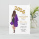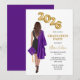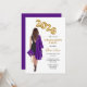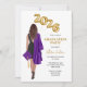Afroamerikanische Frau Einladung zur Abschlussfeier 2026. Einladung zur Abschlussfeier Frau Porträtzeichnung schwarzes Kleid, violetter Abschlussmantel und -mütze, langes dunkles Haar. Abschlussjahrgang 2026 goldene Luftballons.