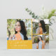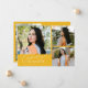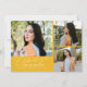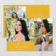 Moderne und verspielte Abschlusskarten-Fotokarte mit 3 Fotos auf der Vorderseite und 1 auf der Rückseite. Der Text lautet "den Absolventen feiern" in Schreibschrift. Fügen Sie den Namen, die Informationen und die Nachricht des Absolventen hinzu, um diese Karte zu personalisieren. Gelb.