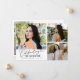 Moderne und verspielte Abschlusskarten-Fotokarte mit 3 Fotos auf der Vorderseite und 1 auf der Rückseite. Der Text lautet "Abschlussfeier" in Schreibschrift. Fügen Sie den Namen, die Informationen und die Nachricht des Absolventen hinzu, um diese Karte zu personalisieren. Weiß.
