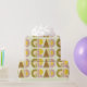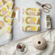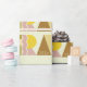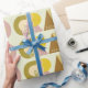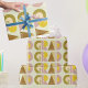 Retro-style Geschenkverpackungspapier mit dem Wort "GRAD" in geometrischen Formen in verschiedenen Farben. Retro-Farben - Gelb, Pink, Braun und Grün - verstärken den Retro-Stil.