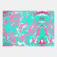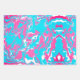 These wrapping paper sheets have an abstract pattern with different colors. One sheet has a white blue pink color theme, another has a teal white pink color theme, and the third one has a dark blue redish-pink color theme.