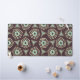 Abstract geometric pattern with layered pentagons and triangles in beige and teal on a dark brown background, creating a retro, symmetrical feel.