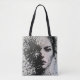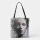 This tote bag features a poetic pixelated face fading into grayscale abstraction. Printed from an original hand-painted canvas by the artist.