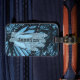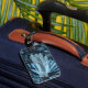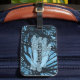 Personalized statement luggage tag with abstract butterfly art in vivid blues.