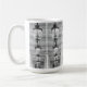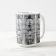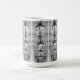 A white ceramic mug covered in a repeating black and white pattern of symmetrical, Rorschach-style inkblots.