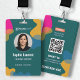 This modern and stylish ID badge features a dark teal green background with vibrant, abstract organic shapes in hot pink, mustard yellow, and navy blue. It's designed for professionalism with clear sections for 'VALIDITY' and 'CONTACT US' information, including space for a QR code. The bottom clearly states 'DEPARTMENT HERE', making it ideal for any organization seeking a contemporary and eye-catching identification solution. This badge combines functionality with a unique aesthetic, ensuring your staff members are easily identifiable while projecting a chic and professional image. Perfect for businesses wanting to add a splash of color and modern design to their identification process.