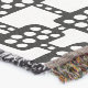 Ein detailliertes, abstraktes Wiederholmuster, bestehend aus einem Netzwerk miteinander verbundener rechteckiger Formen, die jeweils mit zufälligen Punkten oder Löchern verziert sind, erinnert vielleicht an eine seltsame Stadt mit Gebäude, die wie Emmentaler Käse aussehen. Die Hintergrundfarbe dieses Designs kann ebenfalls geändert werden, sodass es in vielen verschiedenen Kombinationen verfügbar ist.
