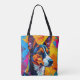 Helle und lebendige abstrakte Illustration eines Basenji-Hundes mit kühnen Farben und scharfen Linien. Ideal für Kunstliebhaber und inspiriert durch kreative und lebendige Haustierportraits.