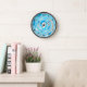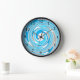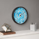 Große Runde Uhr mit schwarzen Händen und Ziffern; abstraktes Spiraldesign in 4 Farben: weiß, grau, hellblau und himmelblau.