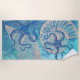Rett dich mit diesem hübschen Strandtuch, das ein künstlerisch abstraktes Design in wunderschönen Blautönen und aquamarin mit Akzenten von Beige auf dem Meeresleben und Muscheln bietet.