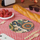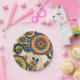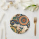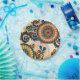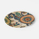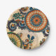 Abstrakte Mandala-Teller mit Blumenmuster in Orange, Blau, Grün und Elfenbein.