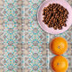 Modernes und einzigartiges Dekorfliesen mit nahtlosem Muster aus geometrischen Formen in Braun-, Beige-, aquamarin-, Grün- und Orangetönen.