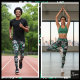 Modische Frauenmodelle, die abstrakte Leggings in Schwarz und Weiß auffallen, ein Muss für alle, die einzigartige und stilvolle Aktiv-Bekleidung suchen.