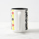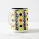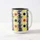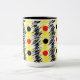 Abstrakte Scribble Polka Dot Muster Zwei-Tone-Kaffee-Tasse entworfen von Nisha Prabhu CuteHomeGifts. Farbiges abstraktes Muster mit schwarzem, senkrechten Streifen-Schreib und schwarz rotem Polka-Punkt auf gelbem Hintergrund.