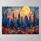 Abstrakte Aquarellbilder eines leuchtenden Vollmonds über einer pulsierenden Skyline der Stadt nachts. Die goldenen Lichter der Stadt verbinden sich mit dem tiefblauen Himmel und schaffen eine magische Atmosphäre.
