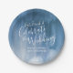 Graublau gedämpfte moderne abstrakte Kunst bemalt Hochzeitszettel Teller. Typografischer Text liest Essen, trinken & feiern die Hochzeit von dann fügen Sie Ihre eigenen Namen unter. Eine personalisierte Ergänzung zu Ihrem Hochzeitsbuffet oder Ihren Party-Tischen. Andere passende Elemente und Farben sind in diesem Design verfügbar. © Original watercolor art and design by Sarah Trett www.sarahtrett.com for www.mylittleedenweddings.com