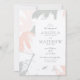 Diese hellen und luftigen 5" x 7" Einladungen zur Hochzeit zeigen ein abstraktes Blatt-Design in sanften Farbtönen und Weisheit mit der Meldung "Bitte schließen Sie uns für die Hochzeit von", mit Platzhaltern für die Vor- und Nachnamen der Braut und des Bräutigams, terminlich verschrieben, Datum, Monat, Jahr verschrieben, Hochzeitsort und Staat der Stadt.