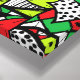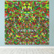 Eine abstrakte Stammeskomposition aus vielen Elementen in Grün, Rot, Schwarz und Weiß wird in diesem farbenfrohen abstrakten, gestreckten Leinwand-Design gezeigt.