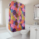 Das Retro-Bad ist mit abstrakten, farbenfrohen Umkleidevorhängen geschmückt.