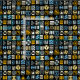 Ein durchgehendes Muster, bestehend aus spielerisch gestalteten, von Hand gezogenen geometrischen Formen und Symbolen in einer Palette von fünf harmonischen Farben.