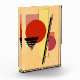 Ein schwarzes Dreieck, unterteilt in Segmente, ein schwarzes trapezförmiges Band, unterteilt in zwei, ein roter Kreis, ein gelbes Rechteck, ein blassrotes Quadrat, ein violetter Kreis und ein orangefarbenes Quadrat in dieser abstrakten Kunst überlappender Formen von Richard H. Fay.