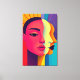 Das Bild ist eine abstrakte, farbenfrohe Illustration mit überlappenden weiblichen Gesichtern im Profil. Das linke Gesicht ist in Rot-, Lila- und Orangetönen dargestellt, während das rechte Gesicht in Gelb-, Grün- und Blautönen gehalten ist und in der Mitte ein neutrales Gesicht in sanftem Gelbton zu sehen ist. Der Hintergrund ist in vier Quadranten unterteilt, jedes mit einem anderen Farbverlauf: Rot, Orange, Lila und Blau. Strahlende Linien von der Oberseite der Köpfe suggerieren ein Gefühl der Erleuchtung oder des Nachdenkens. Die Illustration verwendet kräftige, lebendige Farben und geometrische Formen, um ein optisch beeindruckendes und modernes Kunstwerk zu schaffen.