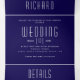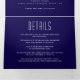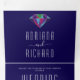 Abstrakte geometrische Schmuckstücke moderne, bunte Juwelen tönt blaue Hochzeitseinladung. Diese moderne Hochzeit lädt zu einem Rahmen aus Dreiecken in Juweliertönen ein: marineblau, violett lila, rubinrot, türkisblau und smaragdgrün mit einem marineblauen Rahmen auf dem Cover und einem Diamanten auf der Innenseite zuerst und die äußeren letzten Paneele. Es hat viel Platz für Ihre Hochzeitsdetails und es zeigt auch ein Foto mit den Initialen des Paares auf der Rückseite draußen.