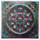 Ein kompliziertes radiales abstrakte aus roten und blauen Stücken prallte zusammen, Set in einen silbernen Kreis in einem komplexen, verzierten Rahmen.