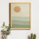 Dieses minimalistische Kunstwerk besticht durch eine ruhige, abstrakte Landschaft mit einer warmen, pfirsichfarbenen Sonne, die in der oberen links Ecke an einem weichen beigen Himmel angebracht ist. Unten sind die sanften Hügel in geschichteten Grüntönen dargestellt, die ein Gefühl von Tiefe und Ruhe schaffen. Die vereinfachten Formen und die beruhigende Farbpalette erinnern an eine friedliche, natürliche Szene, die sich perfekt für die moderne Dekoration eignet oder als beruhigender Hintergrund für kreative Projekte dient.