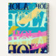 Hola Text wiederholt sich in einer farbenfrohen Palette von Blau, Gelb, Rosa, Türkis und Grün.