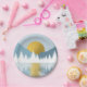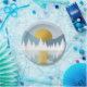Ein schönes Design, das einen schneebedeckten Wald, eine Berglandschaft und einen goldenen Sonnenuntergang oder Sonnenaufgang zeigt, der im Wasser reflektiert. Die Farbtöne sind in neutralen Tönen wie Blau, Weiß und Gold gehalten. Ein rustikales Design, das sich ideal für die Winterferien-Wohngestaltung und die Festsaison eignet.