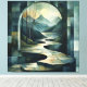 Die abstrakte Landschaft mit einem fließenden Fluss, der von einem gewagten geometrischen Bogen gerahmt ist, lädt zum Verweilen ein. Umgeben von schroffen Bergen und nackten Bäumen, verbindet die Komposition sanfte grüne und erdige Töne mit einer faszinierenden Struktur, die Tiefe und Ruhe schafft. Dieses Kunstwerk ist perfekt für moderne, minimalistische oder naturlich inspirierte Innenräume und dient als herausragendes Herzstück für Kunstliebhaber, die ein Gleichgewicht zwischen Naturschönheit und abstraktem Design suchen.